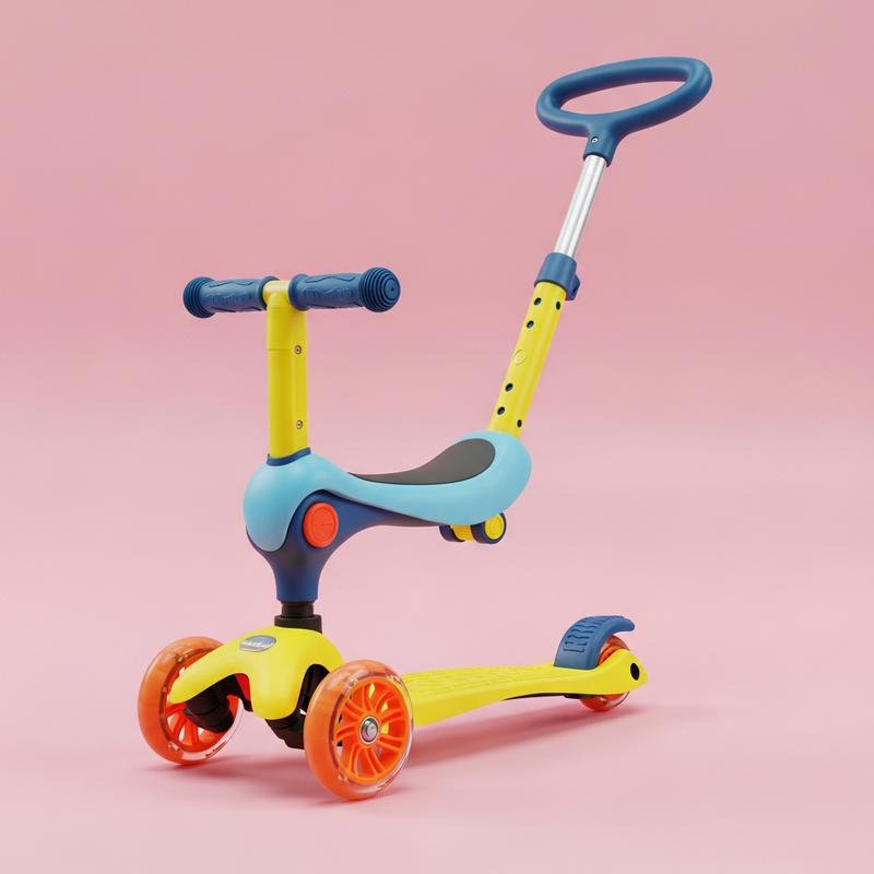 Trottinette évolutive colorée pour tout-petit avec siège ergonomique et canne de poussée, sur fond pastel lumineux.
